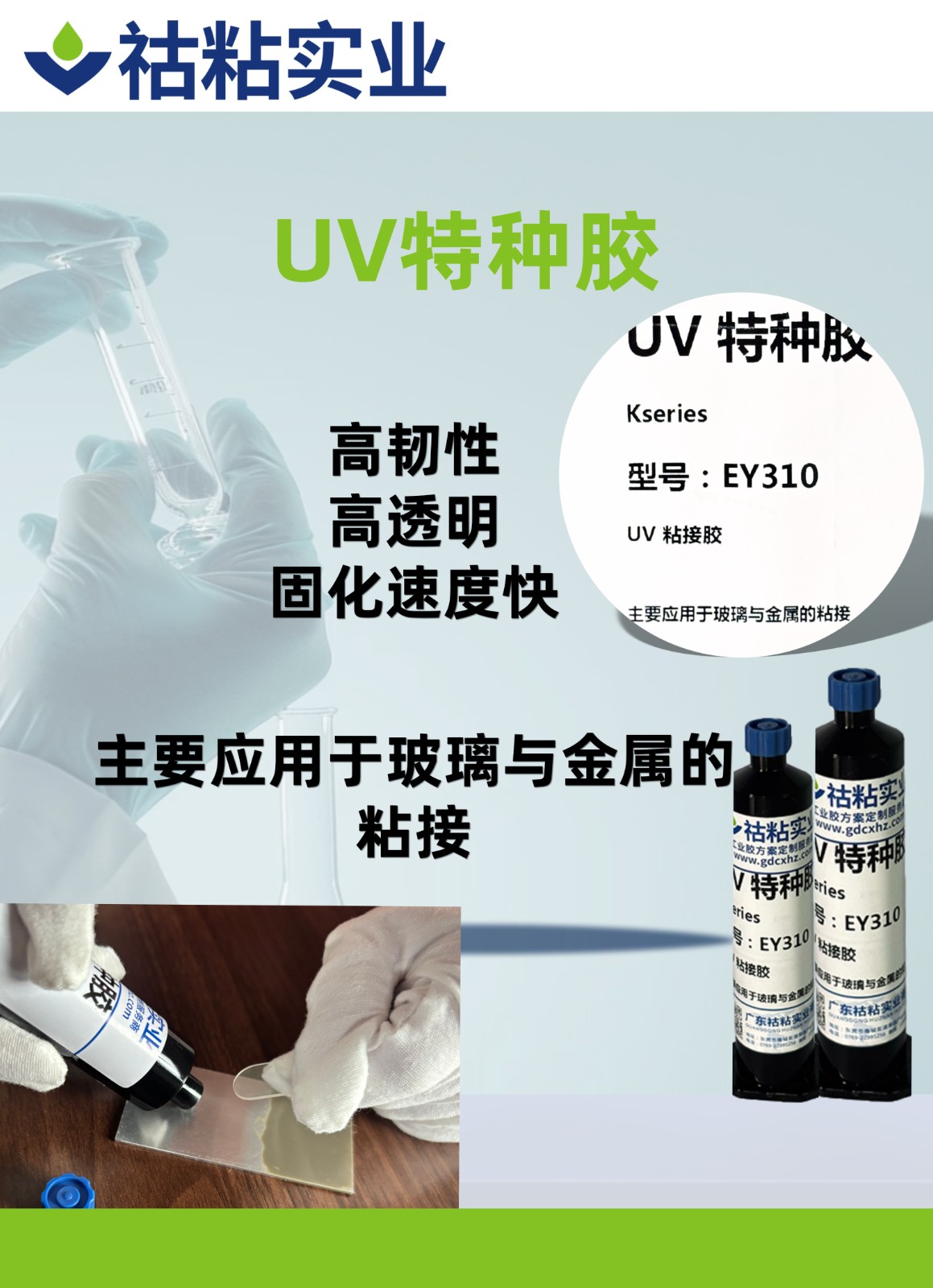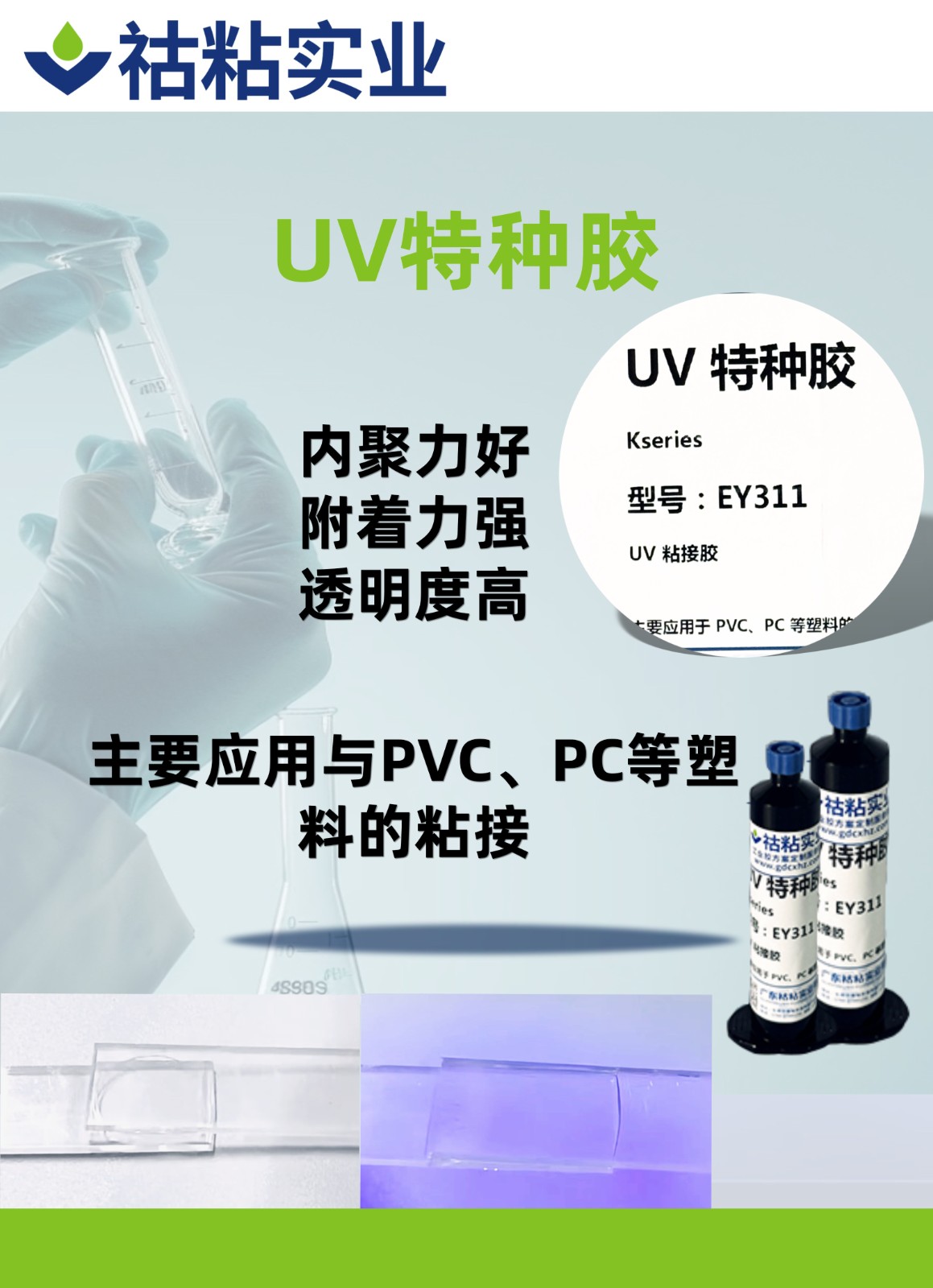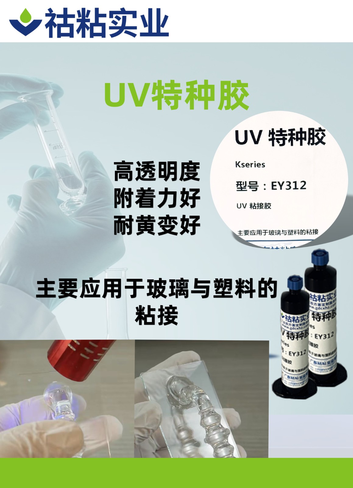 UV膠、光敏膠、紫外 光固化膠,是一種必須通過紫外線光 照射固化的膠粘劑。用於透明物件之 間的粘接與固定,具有高效的固化速 度。它可以作(zuò)為粘接劑使用。固化原 理是其固化材料中的光引發劑(jì)在(zài)紫外 線的照射下吸(xī)收(shōu)紫外光後產生活性自 由基或陽離子, 引發(fā)單體聚合、交 聯化學反應,使粘合劑在數秒或數十 秒內有液態轉化為固態。