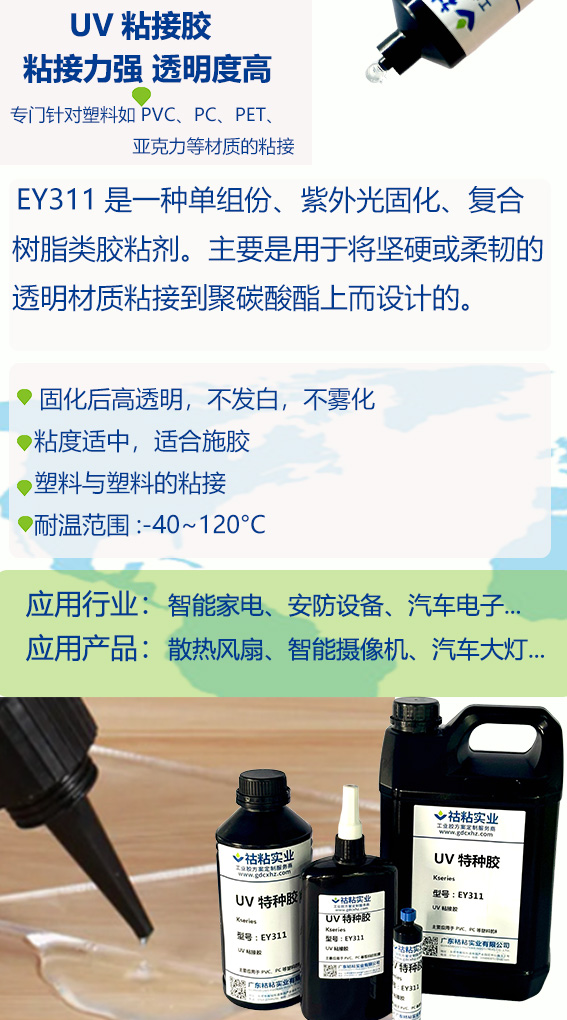 UV膠、光敏膠、紫外 光固化膠,是一種必須通過紫外線光 照射固化的膠粘劑。用於透明物件(jiàn)之 間(jiān)的粘接與(yǔ)固定,具有高效的固化速(sù) 度。它可以作為粘接劑使用。固化原 理(lǐ)是(shì)其固化材(cái)料中(zhōng)的光(guāng)引發劑在紫外 線的照射下吸收(shōu)紫外光後(hòu)產生活性自 由基或陽離子(zǐ), 引發單體聚(jù)合、交 聯化學反應,使(shǐ)粘合劑在數秒或數(shù)十 秒內有液態轉化為固態。